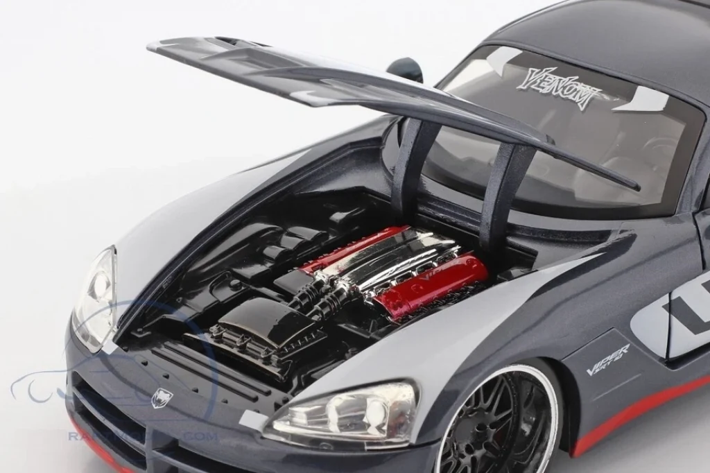 Jada Marvel Venom 2008 Dodge Viper die-cast (metal) gövdeden oluşmaktadır.