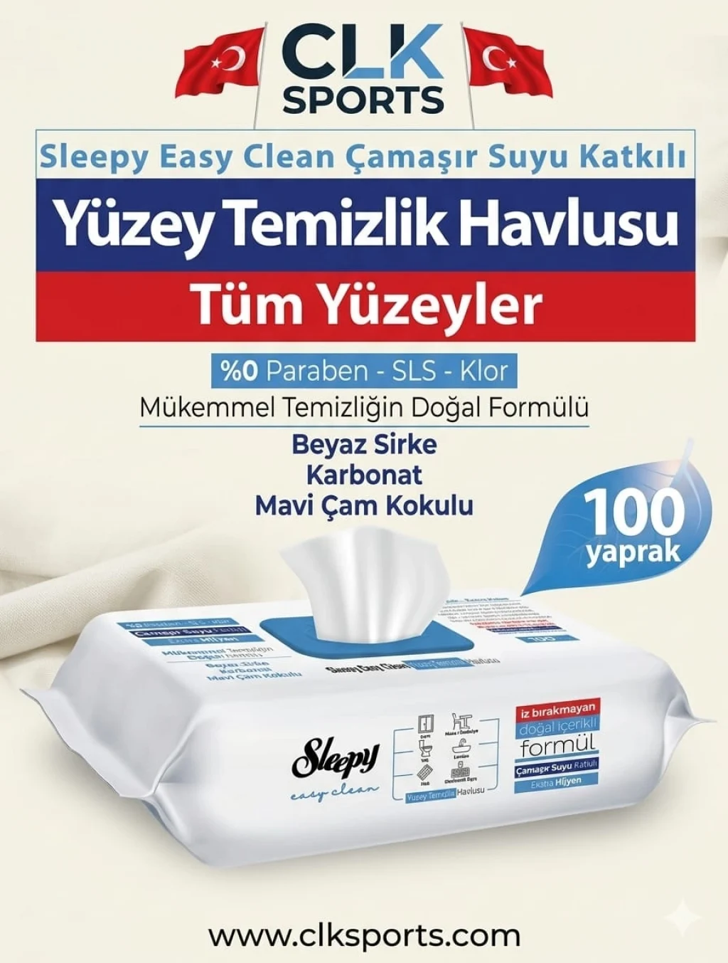 Sleepy Easy Clean Çamaşır Suyu Katkılı Yüzey Temizlik Havlusu, içeriğindeki beyaz sirke, karbonat ve mavi çam kokusu ile cam, ahşap ve seramik, masa, tezgah ve ocak yüzeyleri, telefon, tablet ve televizyon, tuvalet, lavabo, banyo, halı, koltuk ve mobilya gibi kullanım alanlarına sahiptir. Kullan-at özelliğine sahiptir ve boyutları sayesinde tek yaprak ile temizlik sağlar ve yer kaplamaz.